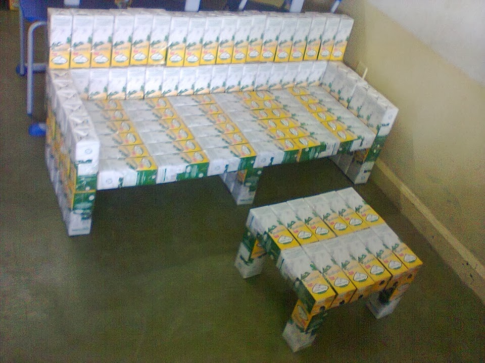 Criatividade unida a responsabilidade socioambiental dos alunos do 2º e 5º Anos do Colégio Polivalente - Ponte Nova fazendo móveis com caixas de leite.